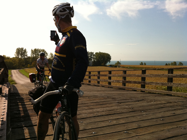 Despite having slept for only 2 hours (at most), we are up at the crack of dawn. The sun is shining, morale is soaring. Our gear is undesirably heavy but away we go. After getting lost (x3) within the first 45 minutes of riding, we ditched our cycling atlas for the GPS maps on our iPhones. Here, JD and I anxiously await the arrival of Joanne on a bridge near Lovekin, Ontario. We really just wanted to stop and enjoy the view.