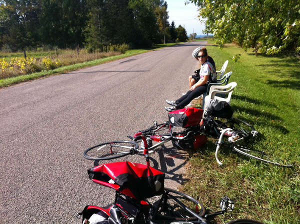 Lakeshore Rd., Port Granby: Three chairs, three cyclists… perfect. Morale = still soaring. Comprehension of the distance that we still have to travel = zero. We devour a couple sandwiches I had made. I was starting to think that I may have underestimated the amount of food we needed.