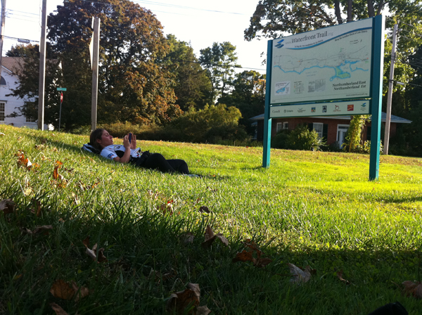 Cobourg: A great town for recreational cycling. We were complimented on our bikes several times as we sat on a patio of a local organic restaurant. We did not come across any dedicated bike lanes downtown, but the traffic was courteous enough that we felt perfectly comfortable riding. It was already 4pm, and we were still about 100km away. With knowledge of the hilly terrain that awaited us, we checked into reality, turned on our iPods and made it a goal to only rest at every 25km mark.