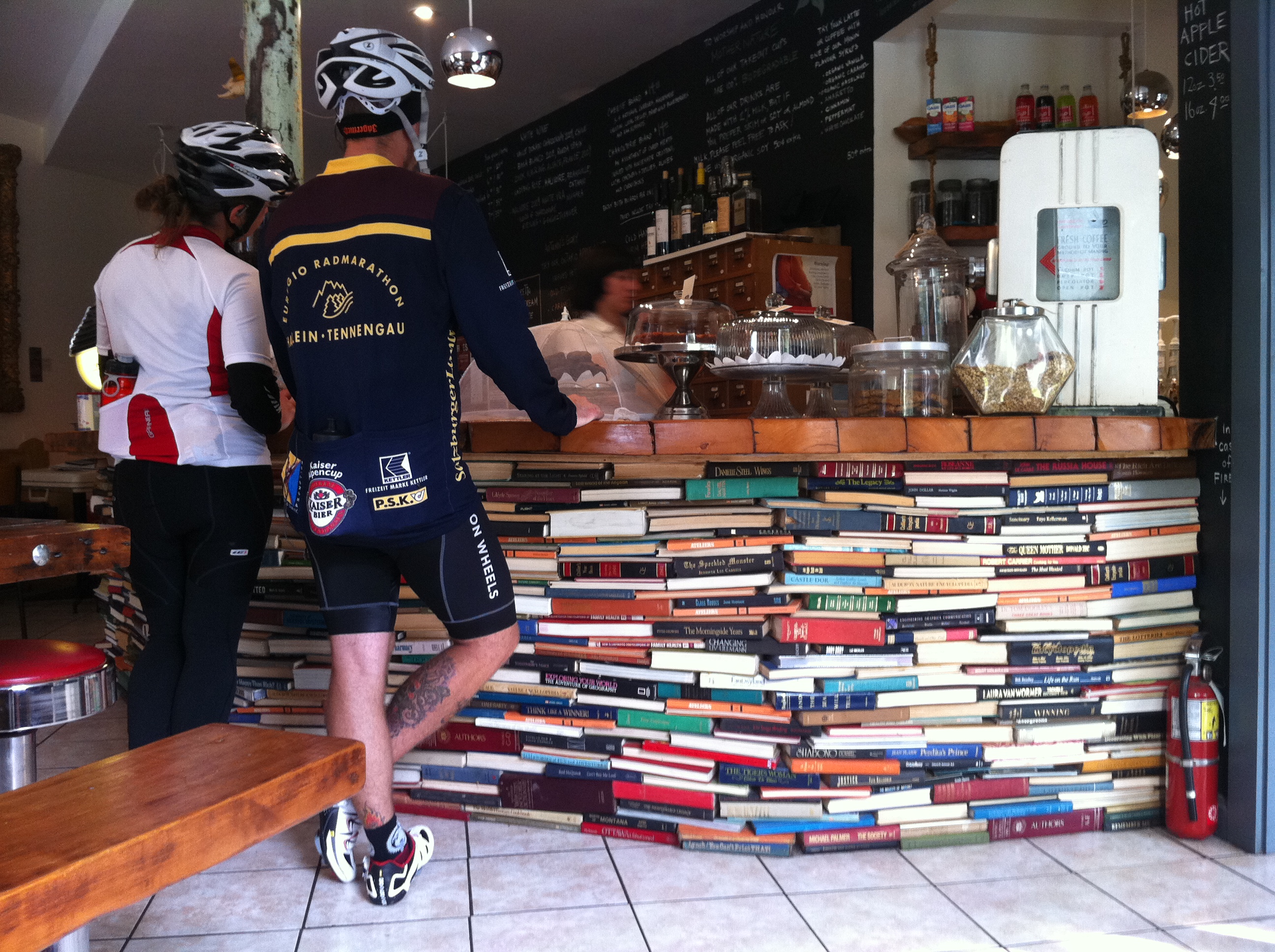 Gananoque: A really cool town. We stopped for an espresso at the Socialist Pig Coffeehouse. I rarely drink coffee, but did this time out of fear of falling behind my now ‘supercharged’ friends. I fell behind anyway because I spent the next hour stopping to go to the bathroom every 20 minutes. Cycling, amongst other activities is not allowed on King Street. We could not figure out why, and cycled through anyway. A couple in the café said they had passed us on their drive over and that we had arrived in great time – the locals were rooting for us.
