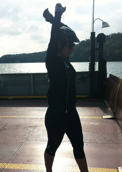A slow start to the morning came after Joanne took our still soaking-wet gear to be dried. We rode several kilometers up (from Picton) to the Glenora Ferry dock. The ferry ride was about 10 minutes long and serves as a continuation of the road (for cars, cyclists and pedestrians) to Adolphustown. We enjoyed the view and snuck in some stretching.