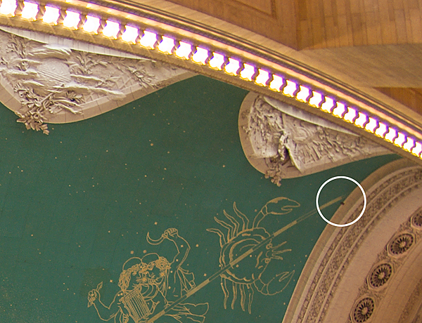 The distinctive rectangle (half on the teal background of the astrological mural, half on the beige bordering) is what the ceiling looked like before restoration efforts in the mid ’90s. The black residue was long thought to be caused from years of exposure to coal and diesel fumes, but spectroscopic analysis found the grime to be mainly from cigarette smoke. Restoration workers left the small patch behind as a reminder of how the ceiling looked before.
