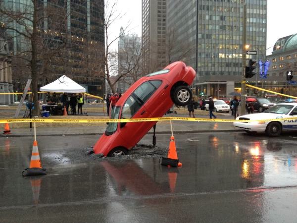 Are potholes the next frontier for outdoor advertising? In Montreal this week, morning commuters were caught off guard by a sedan which appeared to have been swallowed by an enormous pothole on de la Cathédrale. The stunt was the work of an ad agency promoting Pothole Season – a smartphone app to help drivers locate potholes. (Montreal Gazette)
