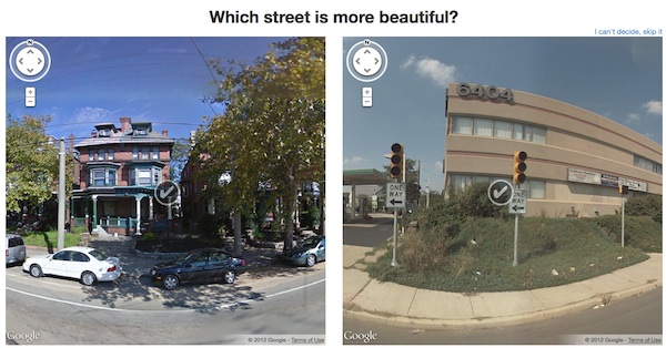 What makes a beautiful street? Tree-lined sidewalks? Brightly coloured homes? OpenPlans is trying to crowd source the answer to this age old question. Their platform, Beautiful Streets, uses Google Street View to provide users with images of two randomly selected streets in Philadelphia. Users are asked to select the image they find most appealing. Data collected will be used to tease out some key concepts of what makes a street beautiful.
