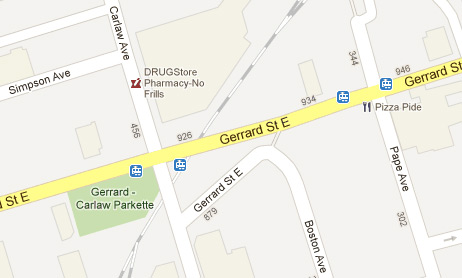 I lived at Pape and Gerrard while that street was still open – they closed it off and made the parkette around 2002. It was a very convenient turn off point when you were heading north on Carlaw and wanted to avoid the blind turn on Gerrard!
