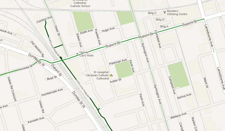 To add further insult, this information comes to light during the city’s Bike Month festivities. Apparently some people at the city are a bit unclear as to the purpose of bike month, which is to promote cycling in the city, not continue with the systematic dismantling of whatever bicycle network we have already managed to cobble together at this point. As shown in the above image from Google Maps, the Dupont bike lanes link up with the West Toronto Railpath as well as the Annette St bike lanes.