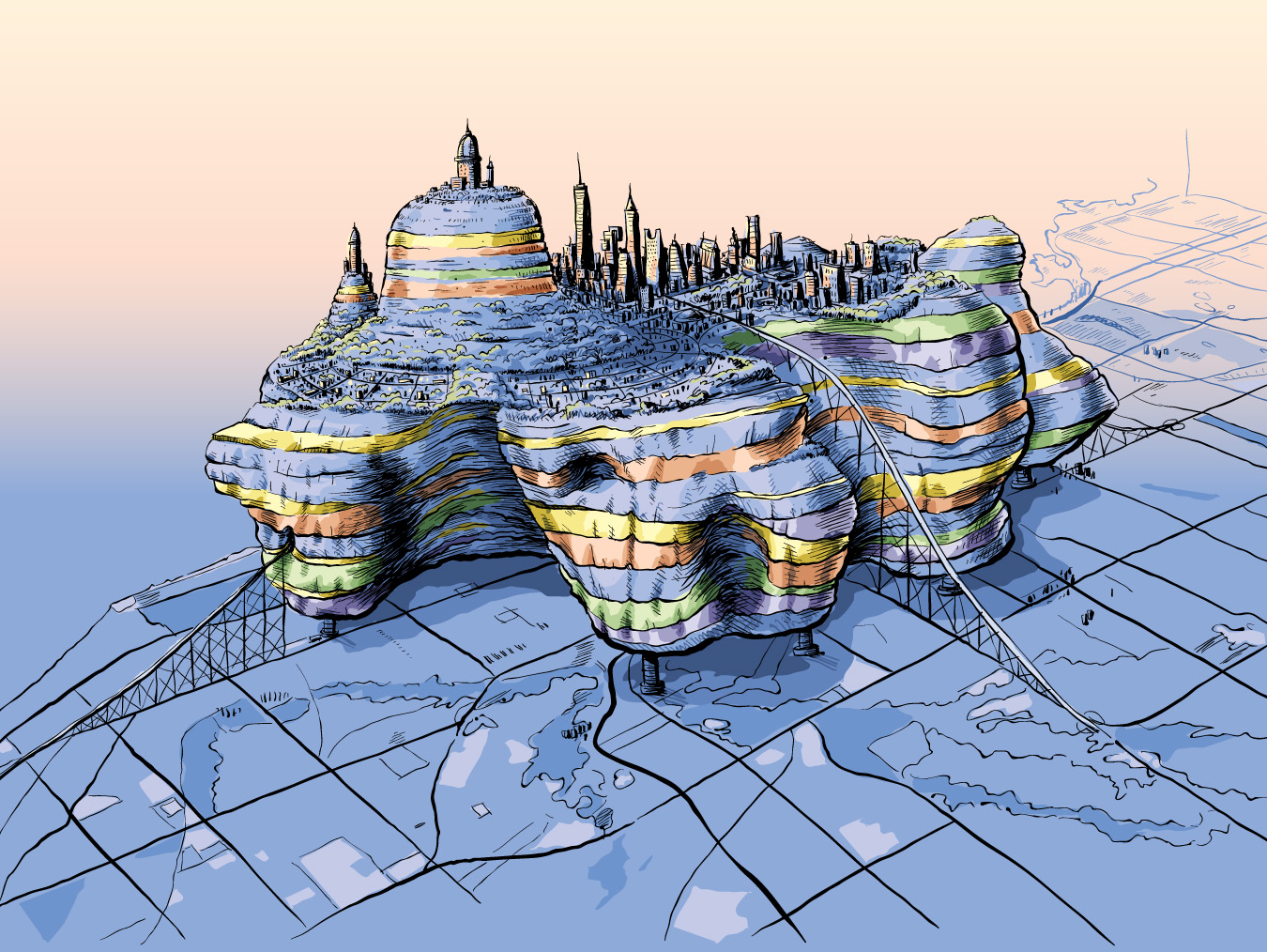 Upper Toronto is “a science fiction urban design project” that proposes the building of a new city, right on top of the Toronto of today. Once this city in the sky is finished, Lower Toronto will be abandoned.