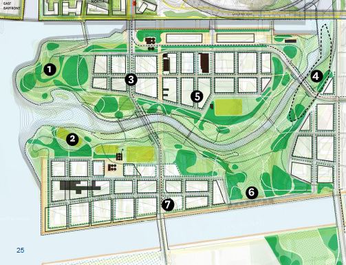 Instead of three nodes, the new plans concentrate the new urban areas on the Port Lands into two larger sections, providing a more focused concentration of people more likely to create viable communities. These sections are, as well, intended to include commercial as well as residential buildings, which would help support a more full-day life cycle.