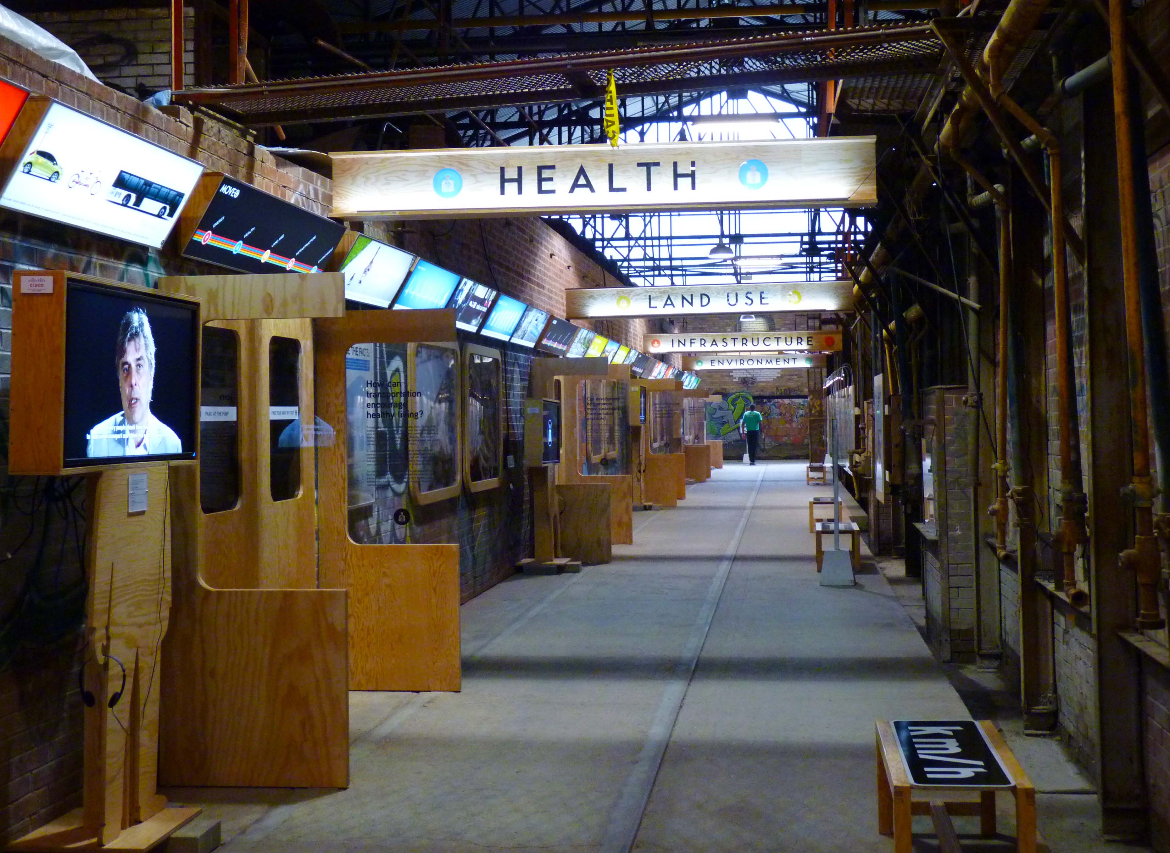 The narrow brick hallways of the Kilns Building are transformed into interactive presentations. To highlight the current challenges related to urban transportation, both locally and globally, a corridor is transformed into a “subway” with windows opening onto photos and data highlighting pressing issues, passengers on video screens discussing impacts, and advertisements above to display promising remedies, currently available.