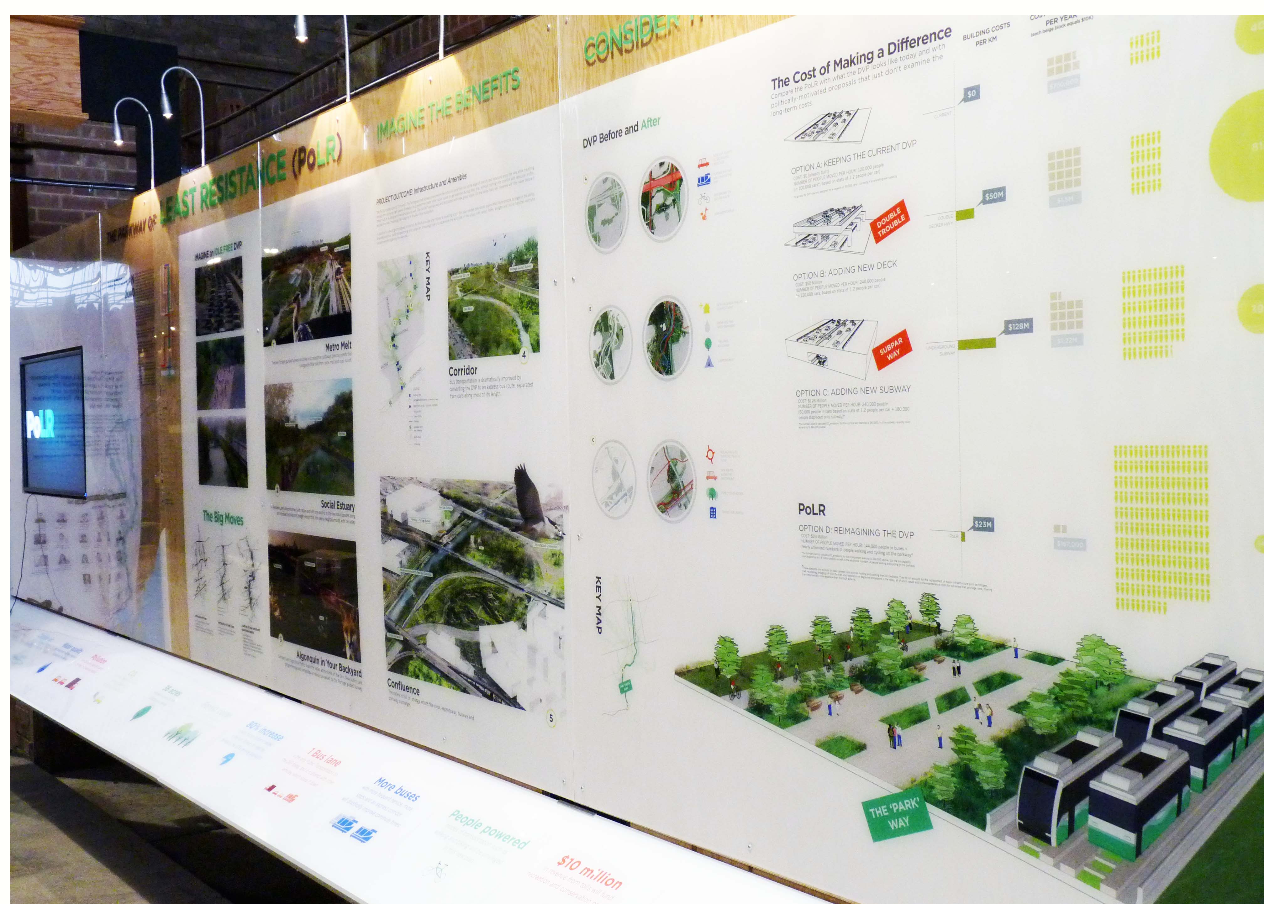 “How can we use nature’s corridors to move through the city?” “How can we encourage active transportation in the suburbs?” “How can we revolutionize the auto industry?” The answers to these questions are explored in a series of panels, projections, maps, and models, focused on the GTA context.