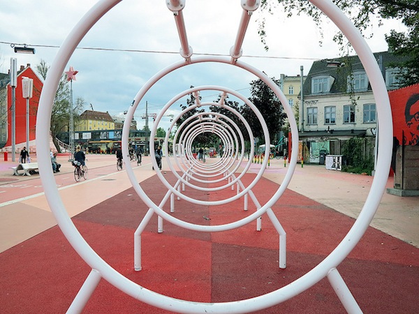 Architizer reports on Superkilen, Copenhagen’s new kilometre-long park that cuts through the Nørrebro neighborhood. The diverse neighbourhood is home to more than 60 nationalities; as such, the park is features cultural mementos from the home countries of the area’s residents. Designed by art group Superflex, Topotek 1 architects, and BIG, the park was designed in a highly participatory manner to maximize “freedom of expression”. The Red Square features bright colours and recreation activities, the Black Square weaves white lines, fountains and palm trees around a rolling landscape, and the Green Park is a linear lawn.