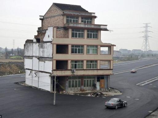 Luo Baogen’s house is the last holdout on the new highway outside of Wenling, China. The highway required the demolition of an entire neighbourhood to provide access to a newly built railway station. According to the article posted on Archinect, these so called ‘nail houses’ “occasionally have resorted to violence. Some homeowners have set themselves on fire in protests. Often, they keep 24-hour vigils because developers will shy away from bulldozing homes when people are inside.”