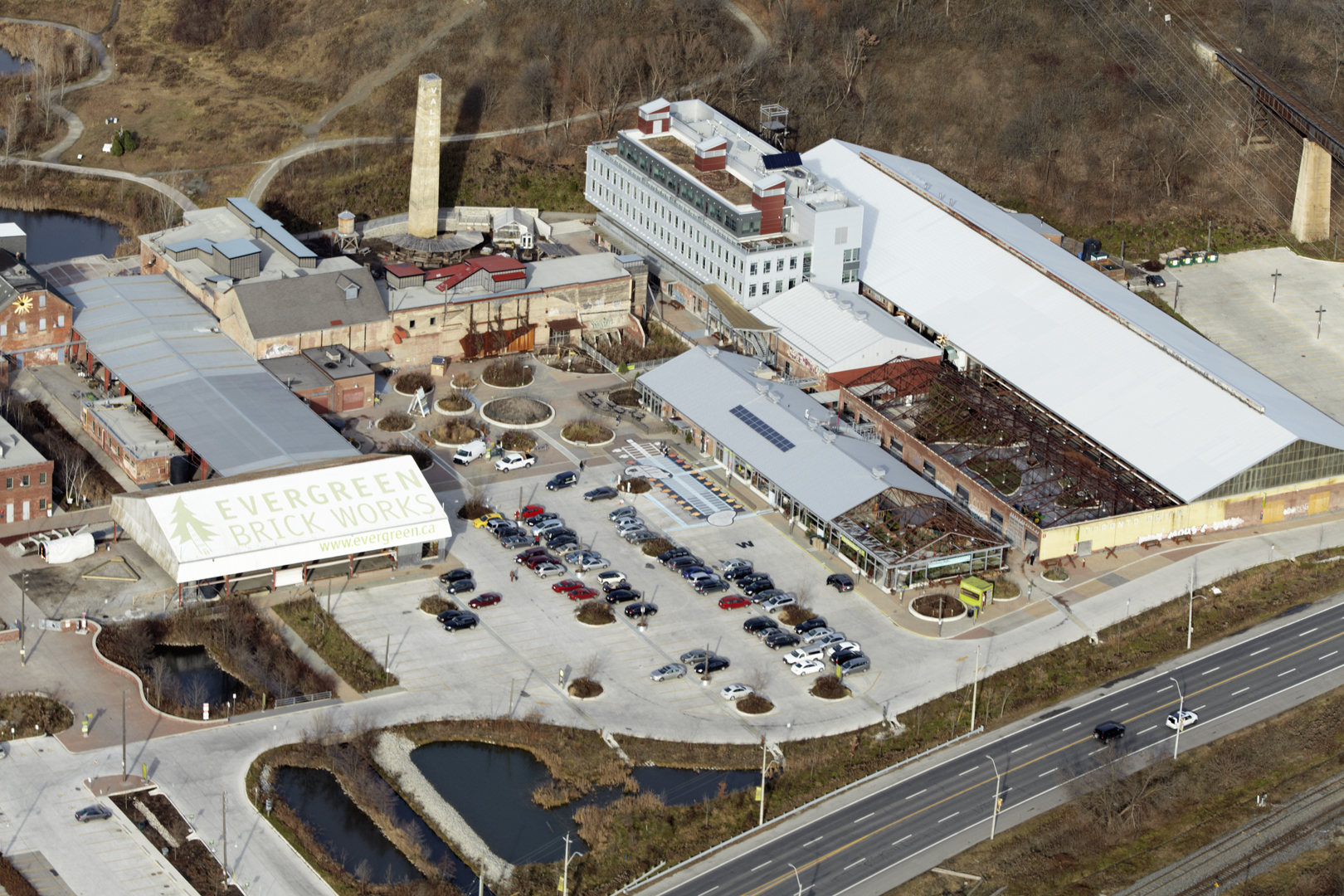 Bergeron: The opportunity to so something at Evergreen was thanks to the City’s new StreetARToronto (StART) public/private partnership program that encourages street art as a way to add beauty and history to neighborhoods. I was contacted by David Stonehouse of Evergreen as I had worked with Evergreen before a couple of times. David thought that there was an opportunity to do something creative in the parking lot to mark where one of the old kilns was. I completed the project with Paul Aloisi. I was contacted by David Stonehouse of Evergreen as I had worked with Evergreen before a couple of times. David thought that there was an opportunity to do something creative in the parking lot to demark where one of the old kilns was. After Paul and I sat with the archaeological excavation document of the site created by David Robertson and his team at Archaeological Services Inc., we came up with a rendering for the painting that is now there.