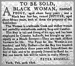 At first, there were about fifteen slaves living in York (though there were ten more just outside town); the majority owned by Russell and his fellow corrupt administrator, William Jarvis. Russell paid wages to a free man, Mr. Pompadour, but enslaved his wife Peggy and their children: Jupiter, Amy and Milly. Russell and his sister, Elizabeth, weren’t happy with them — the Pompadours put up a fight. The Russells complained about them for years; called them “dirty,” “idle,” “insolent” and “pilfering”. As part of her resistance, Peggy would disappear for stretches of time. In response, Russell had her sent to prison for a while, Elizabeth refused to let her back into the house, and Russell finally tried to split the family up.