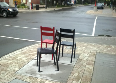 I was in Ottawa last weekend and strolled along Bank St. in the Glebe neighbourhood, which was recently re-done with new street furniture, art and paving (last time I was there, 2 years ago, it was under construction).