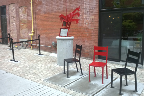 The metal artwork was all done by artist Tim desClouds. My favourite part was the painted metal chairs bolted into the pavement at intervals — both attractive and useful.
