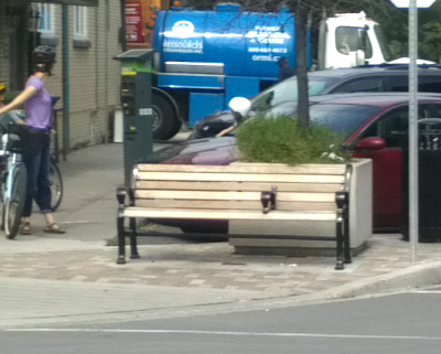 I remember, growing up in Ottawa, Bank St. sidewalks always felt cramped and a bit dingy, even though it had some busy stores and other destinations. The new sidewalk in the Glebe is still not that wide, but the attractive paving and furniture, and the systematic use of side-street areas to extend the treatment (see below), have made it an appealing place for a stroll.