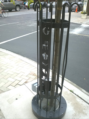The “G” monogram was also visible on the tree-protection fences. These were illustrated with symbols cut into the metal representing the various stores on the street.