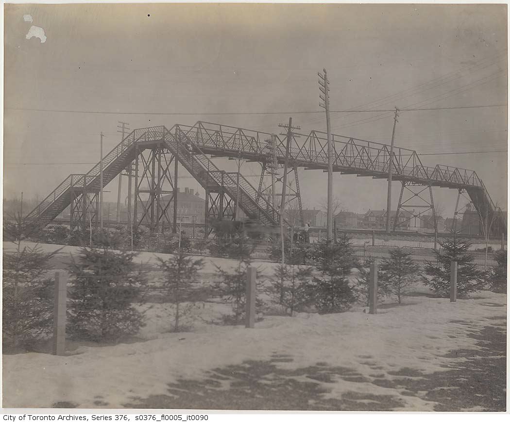 Historically, the first grade-separations of railways and city streets occurred where there was a significant difference in elevation between the street and railway, such as when a railway was built on an embankment or in a deep cut. It wasn’t until the 1890s that overpasses and underpasses were built in Toronto for safety and convenience. The Queen Street Subway at Dufferin Street is one of Toronto’s first major underpasses. The footbridge at Wallace Avenue, connecting that mixed industrial and residential street with Dundas Street, might be the first purpose-built pedestrian grade-separation in Toronto. The footbridge spanned the busy Grand Trunk and Canadian Pacific railways into the centre of the city; today 30 weekday GO Trains, 4 daily VIA trains and the occasional freight train pass underneath. (The number of trains passing through here will nearly quadruple when the Union Pearson Express rail service starts in 2015 and a few of the long-promised additional GO Trains to Brampton/Georgetown are introduced.) To this day it provides a connection (though not fully accessible) between the Junction Triangle and South Junction/High Park neighbourhoods and the nearby Dundas West Station.