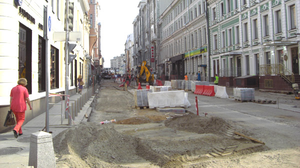While Moscow can’t be described as a pedestrian-friendly city (see below), it is expanding its pedestrian zones with remarkable rapidity. On a visit to Russia this summer, I not only saw newly pedestrianized streets around the city centre (above), but also crossed a street in the process of being pedestrianized (below) — the process was taking just a few weeks from start to finish. It joins up with other ones in the city centre.