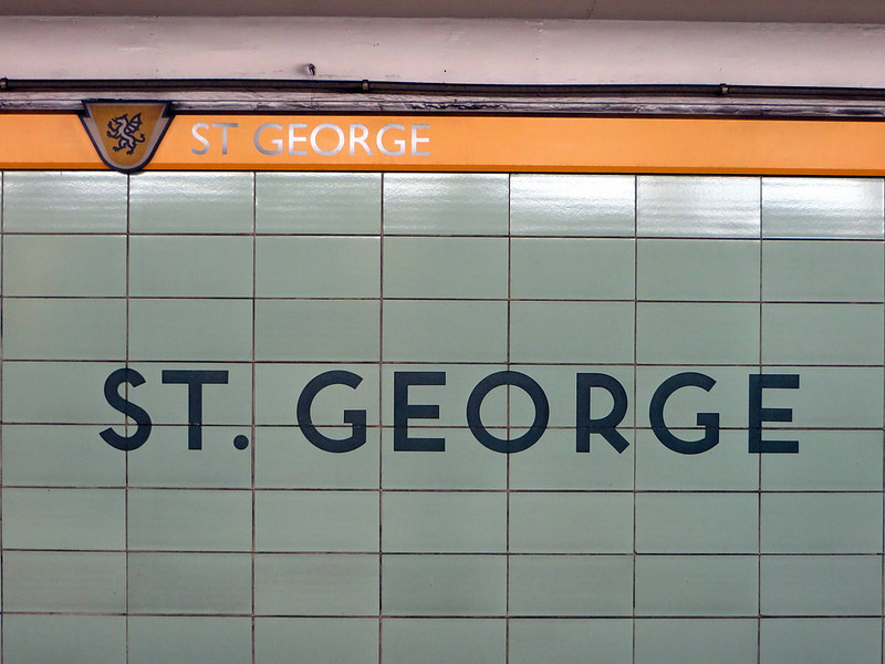 As part of Arthur’s plan, each subway station would have its own unique pictograph contained in a shield adapted from the TTC’s logo; these pictographs would have depicted either the station’s name or local geography. St. George Station’s pictograph, the only one completed, features a dragon similar to those used on crests and shields to represent England (though St. George Street was not named for the legendary dragon-slayer). The shield’s background colour would depict the line the station served. The use of unique pictograms is used in the Metro system in Mexico City; there each subway and Metrobus stop has a unique logo to assist passengers with low literacy skills.