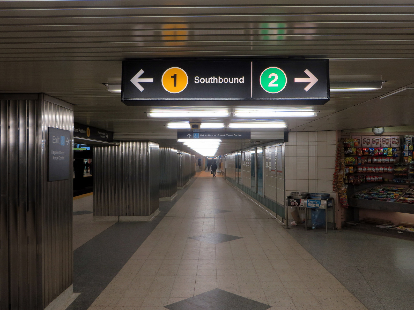 The Toronto Transit Commission (TTC) is currently testing changes to its subway signage. New signs have been rolled out at Bloor-Yonge Station, the busiest in the system, and partially at St. George. While maintaining the basic style of signs installed since about 2000, the most noticeable difference is the use of subway numbers, in large, circular “bullets” — a yellow 1 for the Yonge-University-Spadina Line and a green 2 for the Bloor-Danforth Line. The Scarborough RT is depicted as Line 3, and the Sheppard Subway, the newest subway route, has been designated Line 4. (New subway and LRT routes under construction or proposed would also get numbers — the Eglinton-Crosstown LRT would be designated as Line 5.) There are other changes proposed, including new subway route maps, and there are more changes coming, including revised, simplified system maps and the redesign of bus stops.