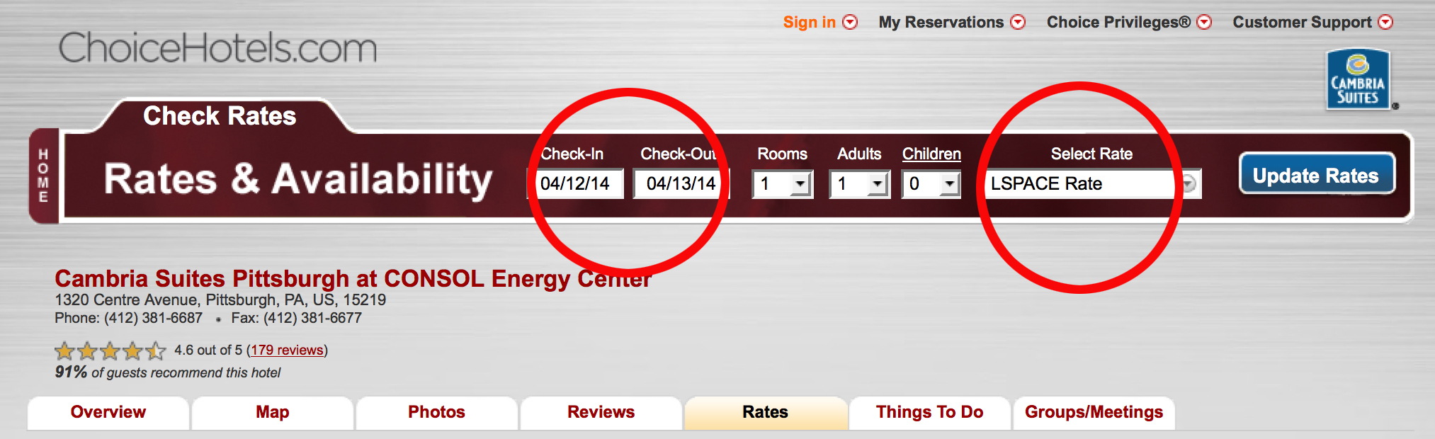 PLEASE NOTE: When you arrive on the web page it will say “no rooms available.” You must enter the dates of your trip into the drop-down menu at the top of the page (see image below). The link should auto-fill our discount code of LSPACE, but double check that this has happened (also see below).