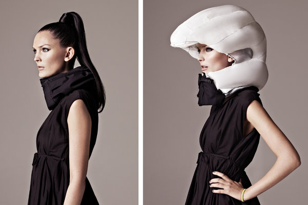 A July 2013 piece in the New York Times style section took note of the rise of the helmet as a fashion accessory, focusing on its infiltration into upscale boutiques and fashion lines. The article cites a Manhattan boutique that sells leopard print and faux-crocodile helmets, the inflatable helmet from Swedish designers Anna Haupt and Teresa Alstin (see image, right), and even a bizarrely expensive $960 one from Gucci. A niche helmet accessory market is even opening up, with one designer catering to commuters who want to protect their hairstyles en route to work with a $48 helmet turban.