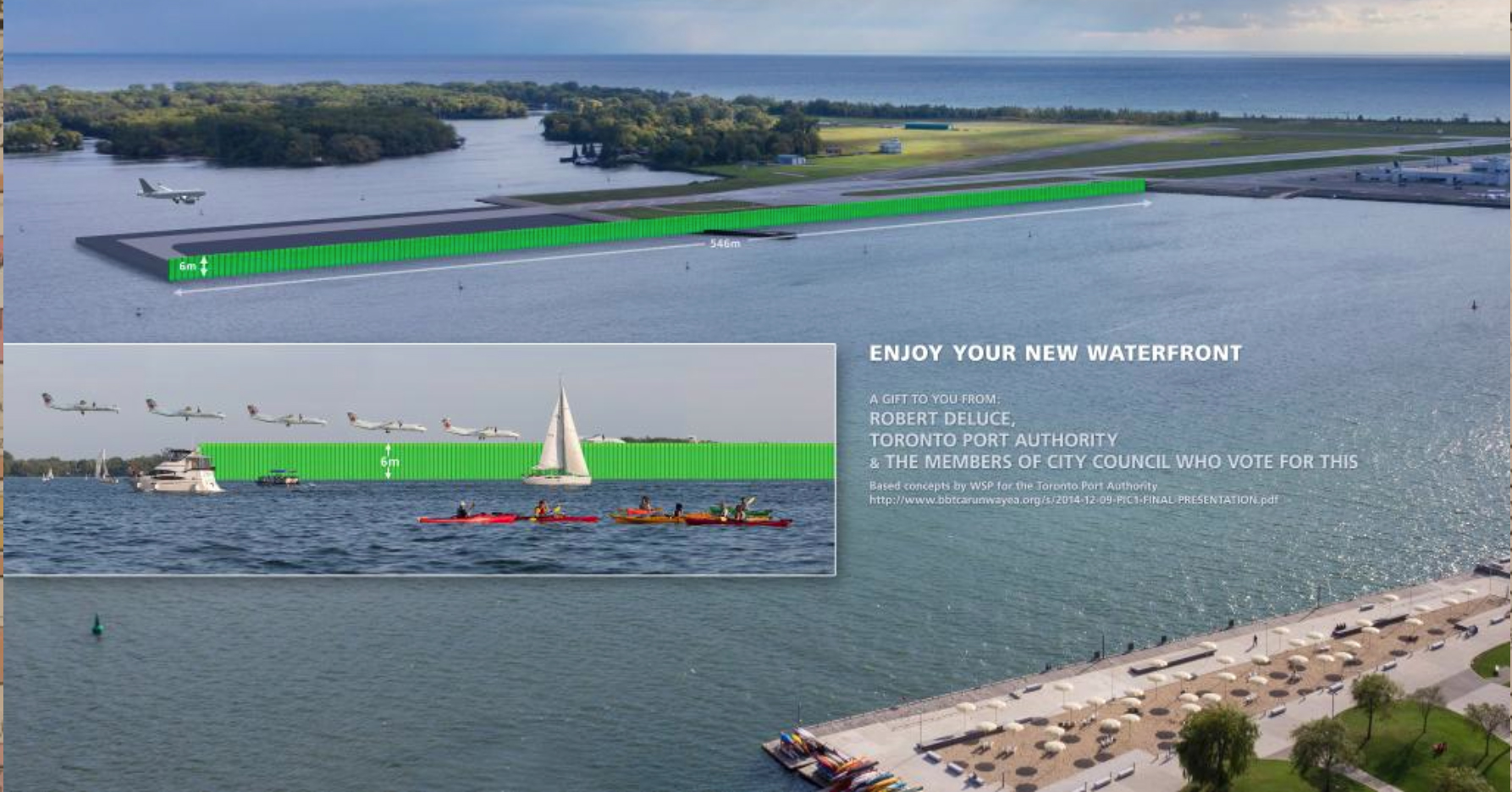 The schematic above was created by NoJetsTO, based on the data provided by the TPA in the ongoing EA scoping process. Waterfront advocate Jude MacDonald points out that the TPA has never provided ground-level images showing how pedestrians and boaters would experience the walls, the enlarged runways and the marine exclusion zone. The slides in the EA presentation show the proposed runway either from overhead or at an elevation, not from ground level, where most of us spend our days. And no one’s come up with an image showing the view from water-level in the harbour looking back at the city, with those blast deflector walls in place.
