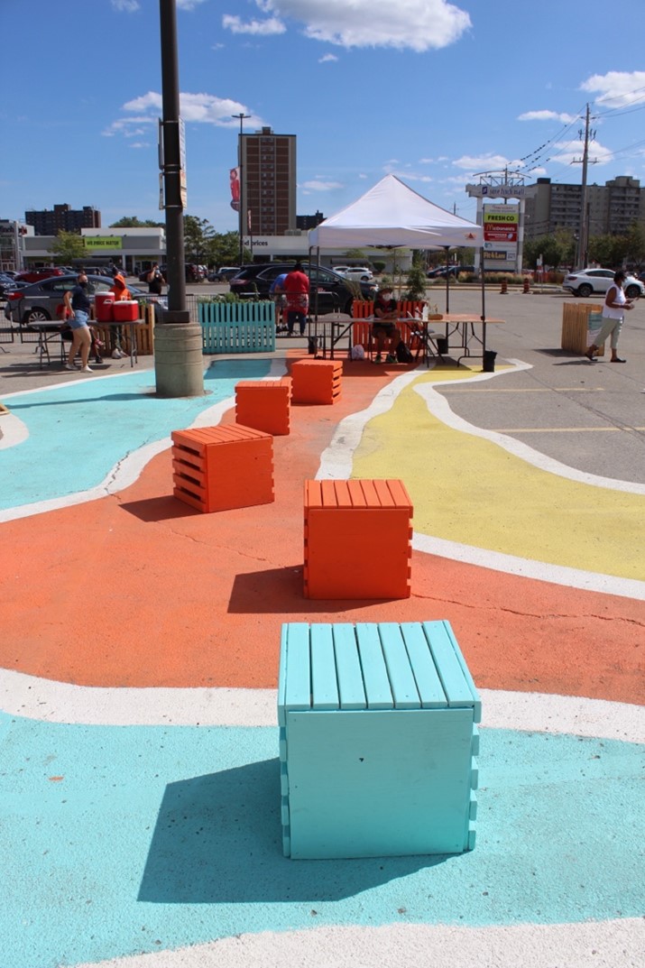 All these elements were grounded by a palette of bright and inspiring shades of blues, oranges and yellows that transformed the grey parking lot. The palette, developed alongside the community, created a striking element that was visible from all angles, especially from the apartments across the street. The design was rooted in the local context by adopting the contour lines of the Black Creek – the beloved neighbouring park network. Inspired by the park’s dynamic topography, the painting created dedicated zones and encouraged social distancing.