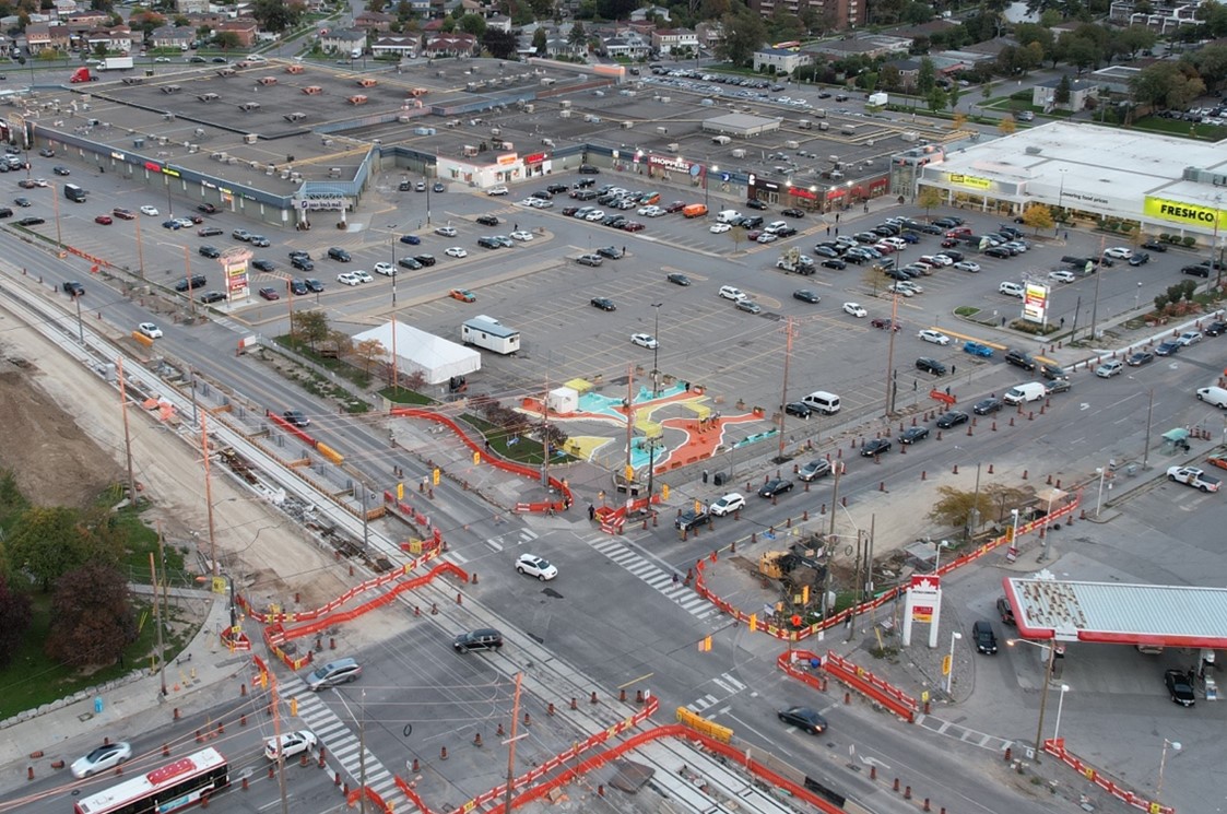 With approximately 10,000 square feet of asphalt in an inner-suburban part of the city, we were working with a complex blank canvas. How would this public space compete with car traffic, three major bus routes, and the emerging construction of the Finch LRT? How would it be visible for the family at the apartment balcony across the street or the person hauling their groceries from FreshCo at the mall? How would it serve as a place to rest but also a place to play?