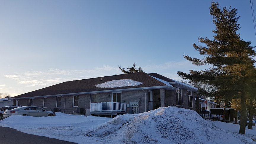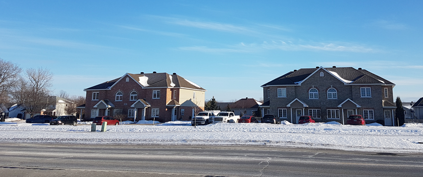 The historically low price of land in Cornwall has also meant that few fourplexes have been built as four-storey structures. A two-by-two configuration is common, and there are also several examples of one-storey buildings divided like a plus sign into four units. These types of housing would likely not be found in denser urban areas. They are spatially inefficient but have low construction costs and can easily accommodate seniors. Two-storey construction allows for easy access directly to each unit, which simplifies construction by not requiring each unit to have access to two stairs.