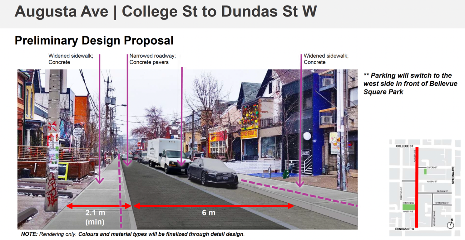 In July, the City presented its preliminary design concepts at a virtual public meeting. Overall, the most noticeable change will come in the form of street resurfacing from asphalt to concrete pavers on Augusta and Kensington Avenues and on Baldwin Street. There are several positive improvements that are proposed in the plans, including more street trees, bespoke lighting fixtures, curb bump-outs and raised crosswalks to improve the pedestrian experience and, in some cases, expanded sidewalks for pedestrians. But overall, the plans tend toward being decorative and generally propose a status quo style of street reconstruction, with a defined curb and roadway. Augusta Avenue alone is being considered for widened sidewalks on both sides of the street, but several design options were presented for Baldwin Street. The City has been clear that full pedestrianization of the Market was not under consideration due to accessibility needs for residents and businesses.