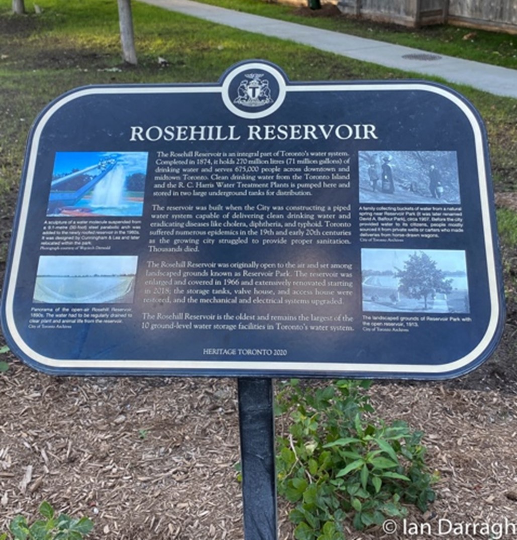 Much of the park sits atop Rosehill Reservoir, Toronto’s oldest and largest in-ground drinking water basin. Constructed in 1873-74, it stores 270 million litres and is the source of drinking water for 675,000 Torontonians. The site of the reservoir was chosen because it sits on a flat terrace above the escarpment that was the shoreline of glacial Lake Iroquois – an enlargement of what is now Lake Ontario that existed until 13,000 years ago, at a time when most of what is now downtown Toronto was underwater. This means that water from the reservoir flows via gravity to households and businesses to the south. The reservoir was last upgraded and covered 1966. The rehabilitation that began in 2018 was a complicated infrastructure project: trees and shrubs on the top and sides of the reservoir had to be removed and all the soil and sod had to be trucked away and stored —nearly 32,000 cubic metres, more than 2,000 dump-truck loads. Like an iceberg, most of the Rosehill Reservoir rehab project was out of sight. The bulk of the contract ($30.6 million) was allocated to upgrading pumps, valves, pipes, and electrical systems inside the reservoir and connecting to the city water system; and to repairing, cleaning and waterproofing inside the reservoir and its roof. What we now see above ground, the park amenities and upgrades, cost $4.8 million.