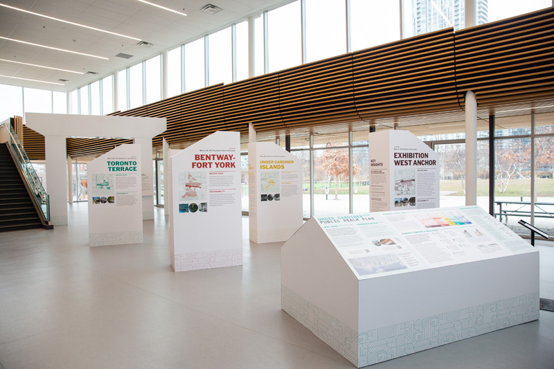 Unlike a typical city planning public meeting, upon arrival at the drop-in visitors are immersed in a five-column installation that walks them through the planning process. These columns act as informative presentations for each geographical area the Conservancy plans to revitalize. Each of these four-sided columns shares its location’s current state alongside its transformation proposal, while providing space for community feedback in shaping its future. Meanwhile, visitors can check out a comically large model of a bent — the iconic architectural concrete pillars that support the expressway — and ask Sam Carter-Shamai, the Bentway Conservancy’s Planning Manager, questions about all things under the Gardiner.