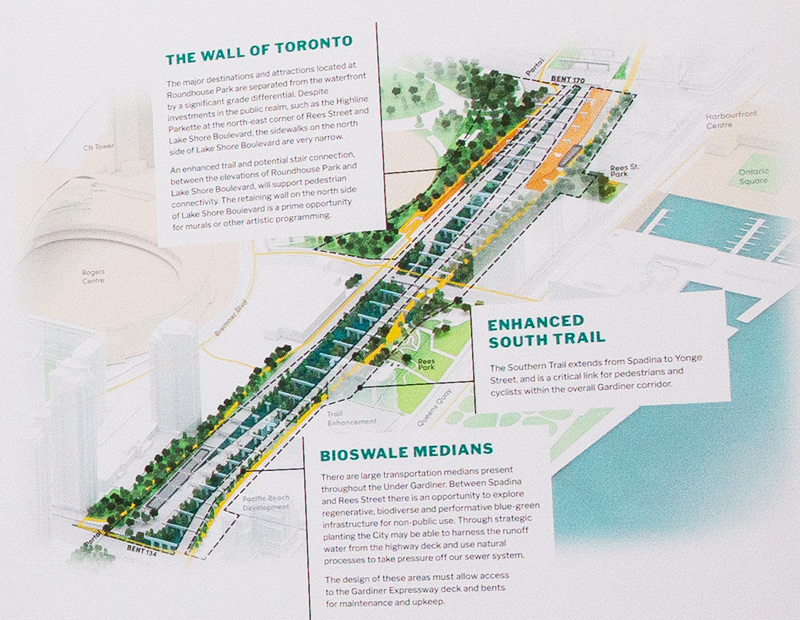 This project was built on the shoulders of the community. Through direct mailing campaigns, interactive map comments, and street team outreach, among other forms of data collection, the Bentway Conservancy team has been able to gather over 18,000 points of contact from surveys sent out, post cards mailed, website impressions, and so on. After an afternoon of talking to people on the street Carter-Shamai said, “once people realized I wasn’t trying to sell them something, but rather asking for their opinions, they seemed happy to talk!” Although many Torontonians are enthused about improving this area in the city, others have concerns about cost and funding, the impact on traffic and transportation, and the displacement of existing communities.