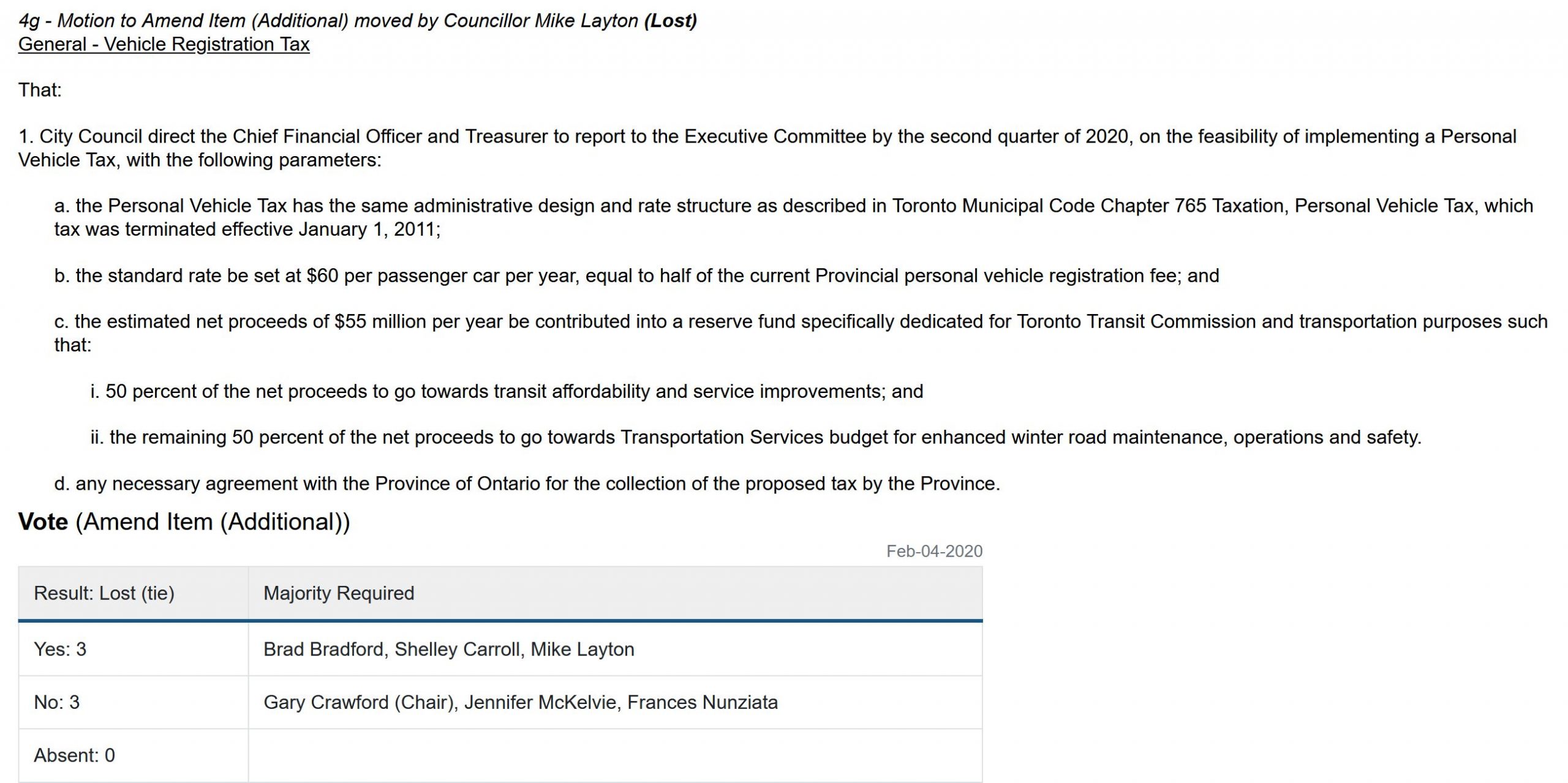 Progressive councillors proposed it again in 2021, to no avail. With Layton gone and a new slate of councillors this year, however, no-one took on Layton’s mantle as a vehicle registration tax champion in this year’s budget deliberations (they may have hoped that a more general review of revenue tools that was approved might include it, but no-one moved a motion to explicitly do so).