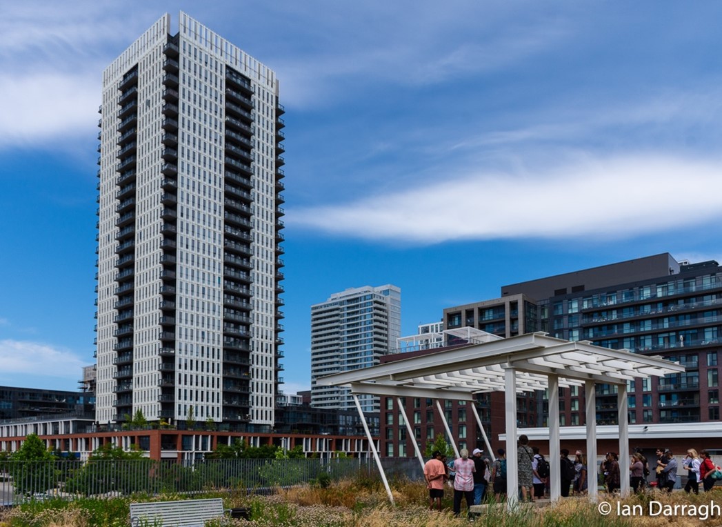 Sean Brathwaite told us that the mix of subsidized and market-value condos in redeveloped Regent Park has been so successful that requests for proposals have been made to construct two more condo towers. New parks will likely be designed on the rooftops of these buildings, since there is no more vacant land available for green space at street level. Before the redevelopment, there were no banks or services in Regent Park. Now banks, a pharmacy and other retailers have opened stores on the ground floors of some of the residential towers. St. Michael’s Hospital has opened a clinic and George Brown College has a satellite campus. Residents of Regent Park finally have access to services in their neighbourhood. Sean told us a few market-based condos have sold for over a million dollars, proving that Regent Park is now a desirable neighbourhood to live in, and another indicator of the high cost of real estate in downtown Toronto.