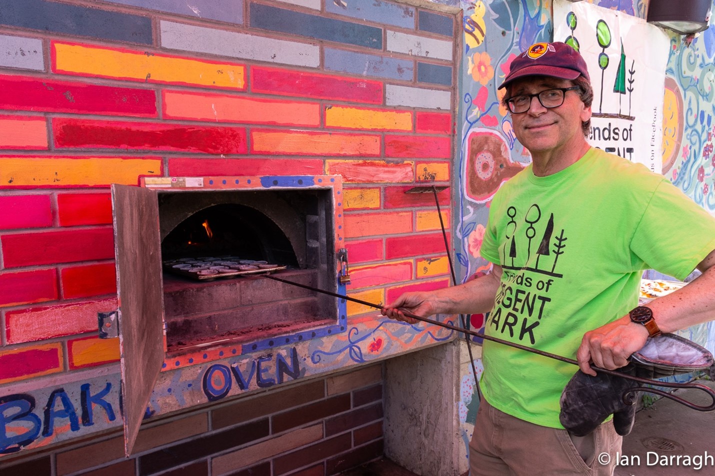 Our guides were Lucky Boothe, a City of Toronto recreation supervisor, and Sean Brathwaite of Friends of Regent Park. A highlight of the tour was the Regent Park Community Centre. Its facilities include a climbing wall, indoor track, and basketball courts with gleaming wood floors. We trooped up the stairs to the community garden on the roof. Connected to the community centre is Nelson Mandela Park Public School, and its students have an opportunity to grow vegetables in the rooftop garden. From the rooftop, we could see children playing soccer and taking a physical education class. In Regent Park itself, children were playing games and volunteers from Friends of Regent Park were baking scones in an outdoor wood-fired oven. The neighbourhood was bustling.
