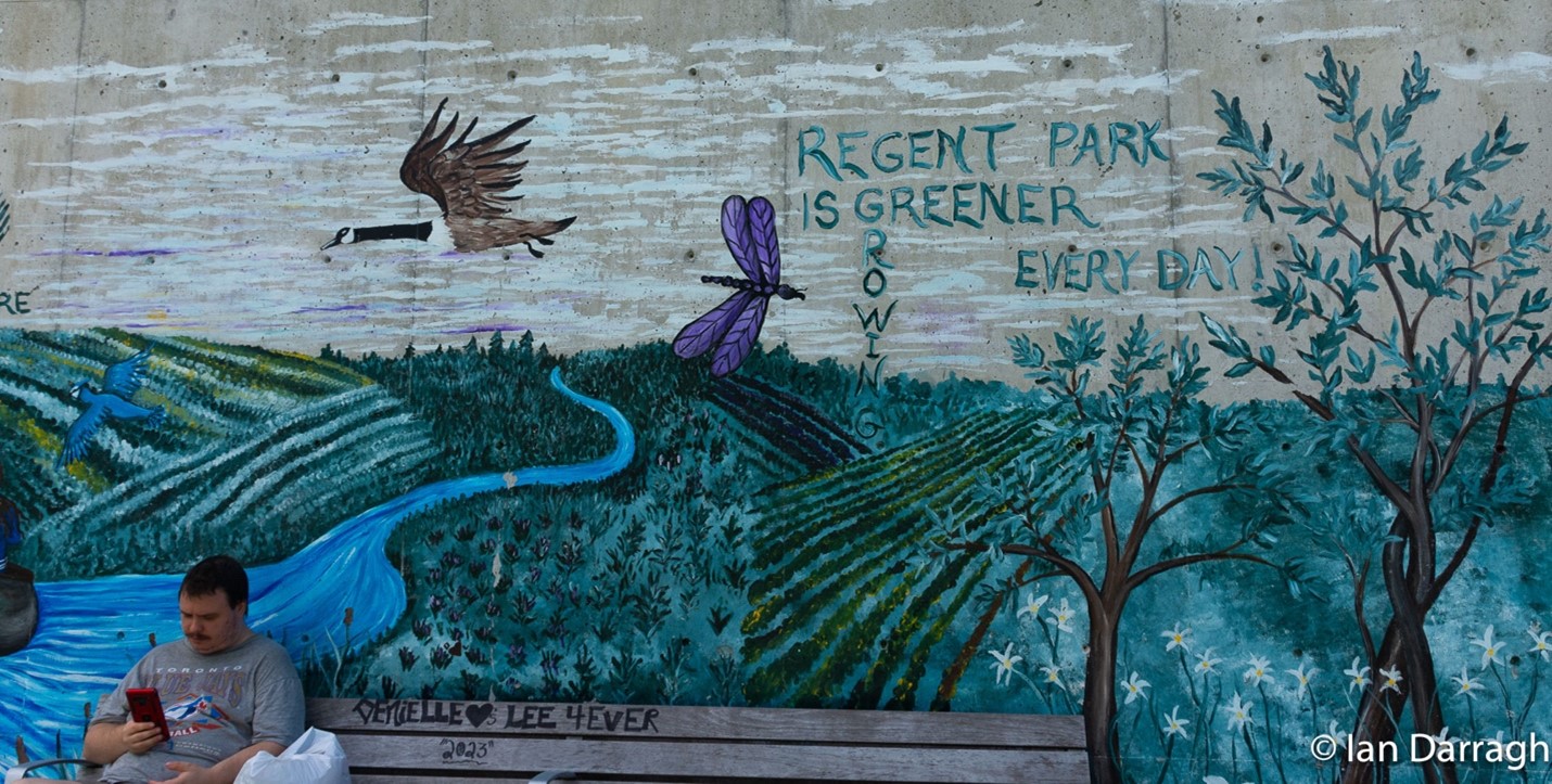 We were taken on a field trip to Regent Park, a neighbourhood in downtown Toronto that underwent a massive redevelopment starting in 2005. My last visit to Regent Park was in 2015, when I organized a poetry reading by George Elliott Clarke at the Daniels Spectrum arts centre for Black History Month. I was curious to see how well all the new facilities at Regent Park have aged. Fortunately, I was not disappointed.
