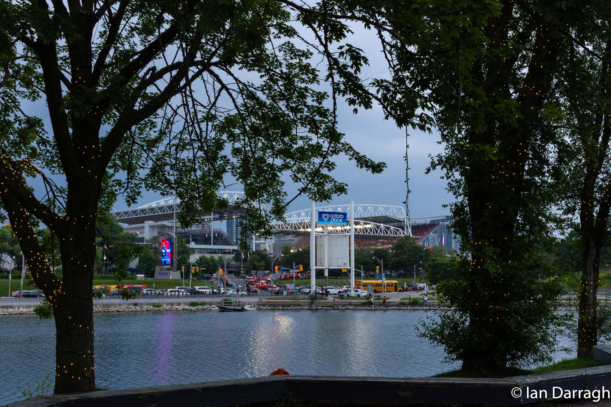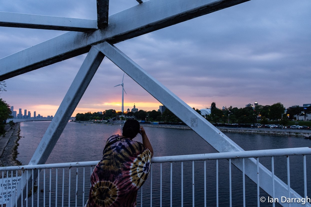 Some of the old magic of Ontario Place remains despite the years of neglect. The trees along the path to the bridge to the mainland were wrapped in tiny lights that glowed, guiding me home. The bridge to the mainland was crowded with folks taking photos and selfies of the sun setting behind the wind turbine on Lake Shore Boulevard. A woman in a sari visiting from Philadelphia asked me to take her portrait with the sunset in the background, and handed me her smartphone. Screams of folks on the Ex’s rides and disembodied guitar chords from the rock concert at the Budweiser Stage echoed across the water. But up on the bridge to the Ontario Place’s West Island there was a sense of calm and community.