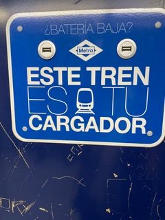 On the train there is a little sign beside the charger that says “Este tren es tu cargador” — “this train is your charger.” That little sign stayed with me because, in addition to providing a very helpful service, a train-as-charger struck me as an excellent metaphor for public transportation and the city as the Spanish see it.