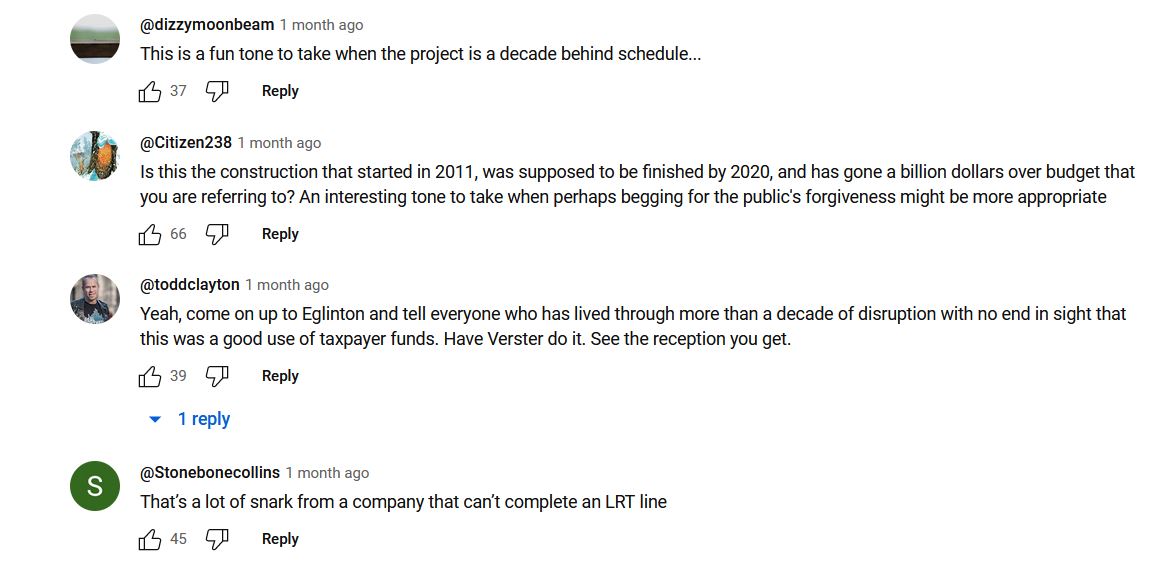 However, it was in their latest campaign, first posted on October 25, 2023, that the tone of Metrolinx ads became explicitly hostile to those levelling their concerns. This hostility is to me the source of Torontonian’s frustrations with the most recent campaign of Metrolinx, which uses the tagline “See beyond the construction.” This campaign was clearly received poorly: it has not been publicly posted to the Metrolinx Youtube account (though I was able to find it unlisted with some digging). Even a cursory scroll of the comments below this video is telling; “That’s a lot of snark from a company that can’t complete an LRT line” writes one commenter; “These are just embarrassingly bad. Kind of like Metrolinx’s track record for finishing projects on time” quips another.