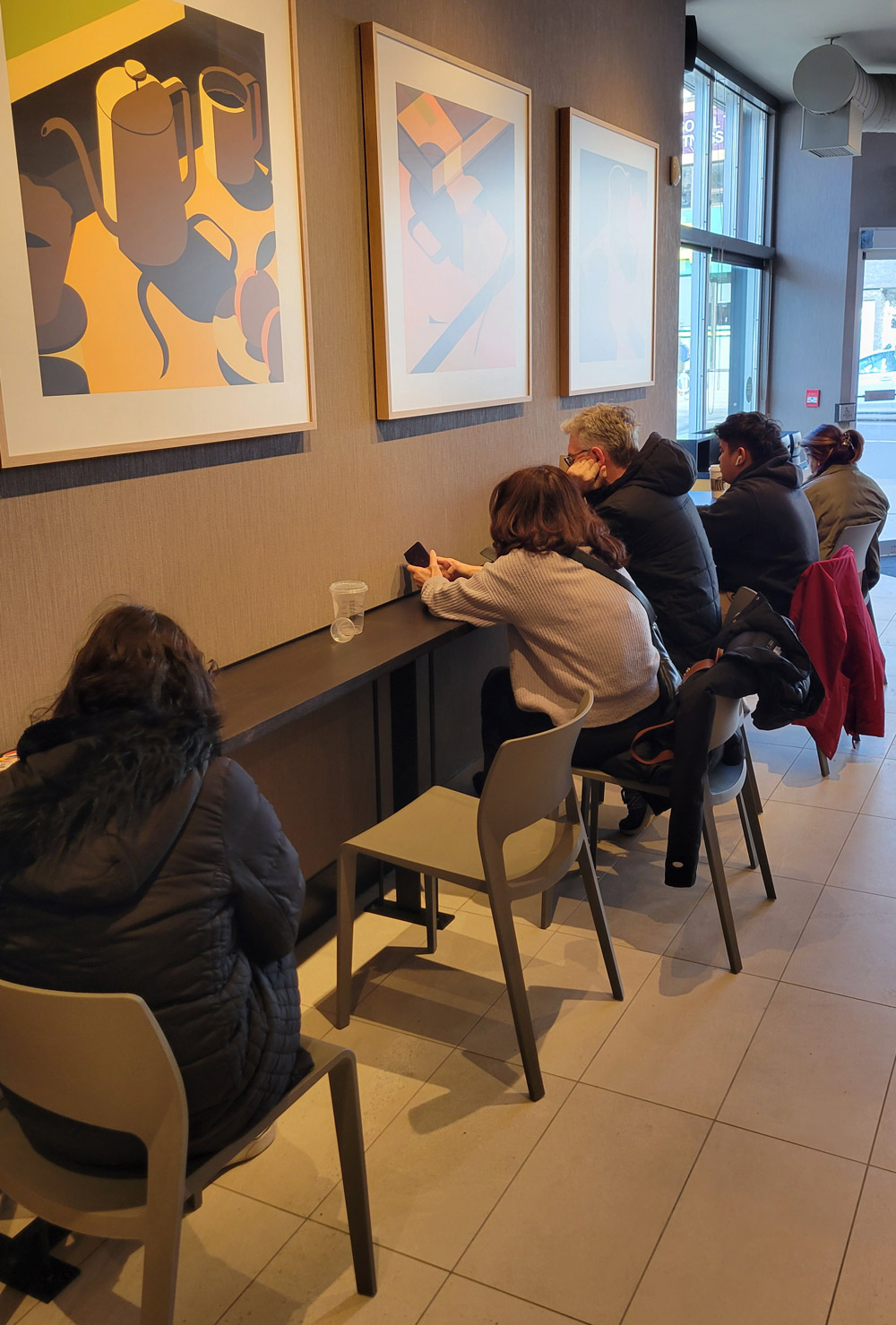 It seems like they have a lot of indoor seating despite having a small cafe footprint. I don’t see what the complaint is though, is the writer arguing that the furniture isn’t as comfortable as a couple plus chairs? The truth is stores need to expand their BOH and frontline area in order to service their customers and that comes at the expense of some cafe space. Hence the shared wall table and stools.