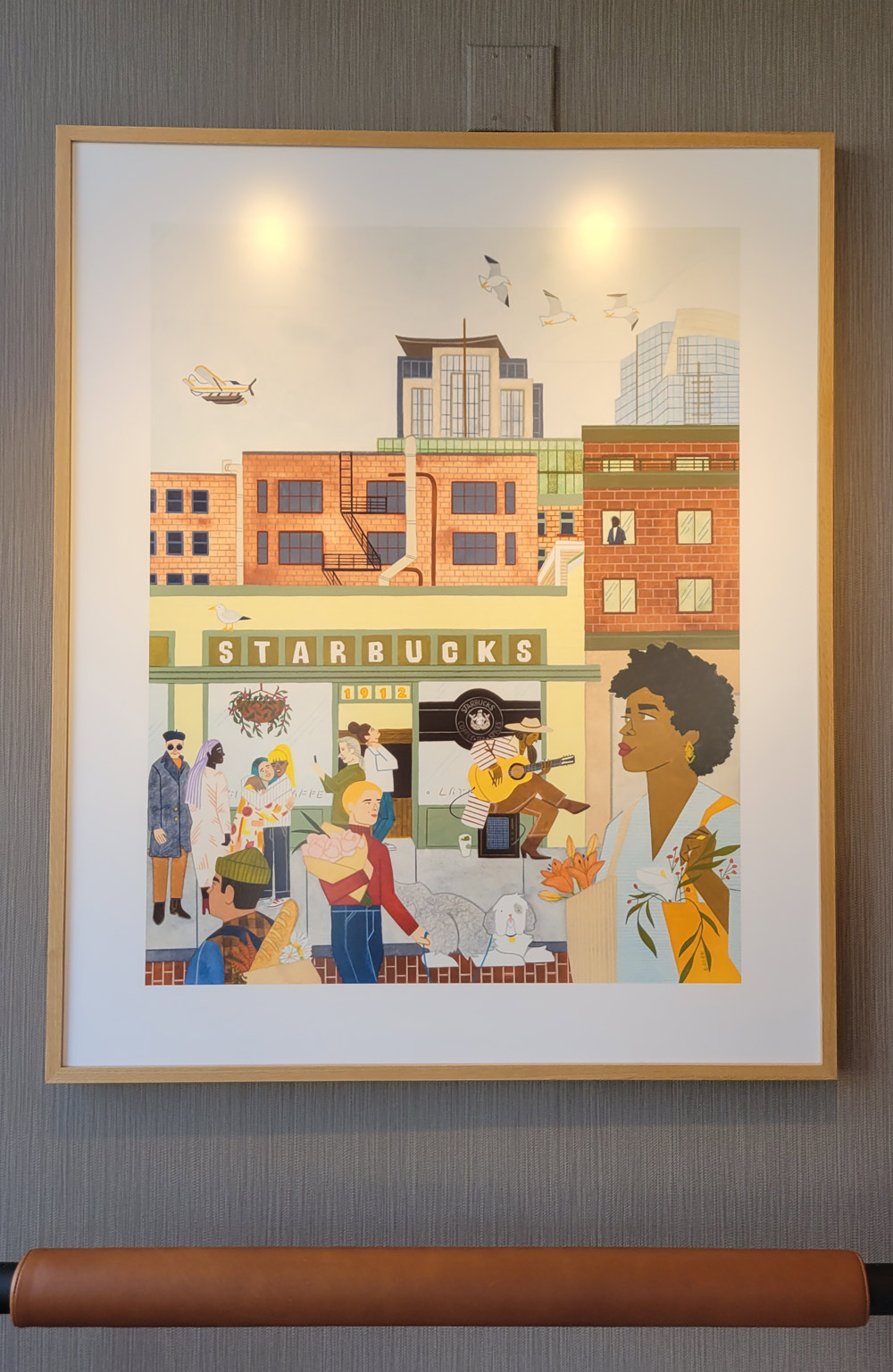 Even the corporate art is just boring cell-shaded images of coffee pots and mugs. One piece that encapsulates the heart of Starbucks’ current contradiction is placed above one of the uncomfortable leaning bars. It’s an illustration of a community of locals congregating around a Starbucks location, the first ever location opened in Seattle to be precise. They’re young, diverse, artistic, queer-coded, and sharing the public space in front of a community-integrated coffee shop that even the busking musician has decided to get their coffee from. It’s a pleasant image, but it reflects the corporate mythos that Starbucks so desperately wants its clientele to still see in them.