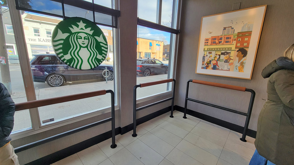 It’s unsurprising that the location would optimize its layout for a new digital ‘frictionless’ consumer era, one in which social communities have all but shifted online to platforms, and where companies focus increasingly on the commodity, rather than the setting, community, and atmosphere that the commodity is consumed within. The reason this redesign is concerning to me is not just that the company has decided to literally cut corners off their counter and their overhead, but just how antithetical adding hostile architecture to the space should be to Starbucks’ own purported ethos.