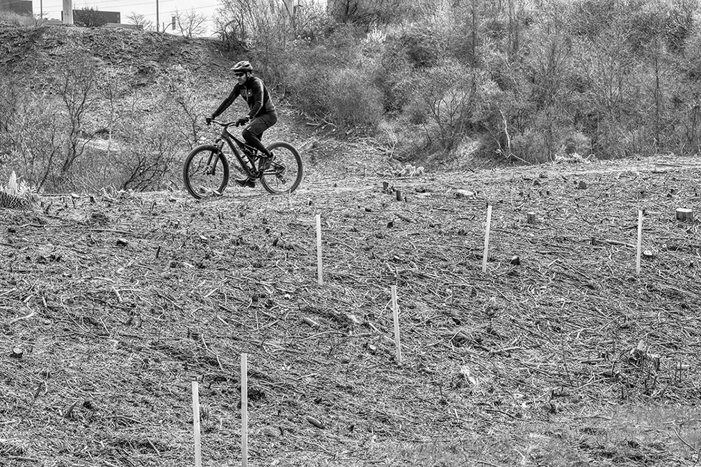Earlier this year, the hill above the Filtration Plant was clear cut. All the trees, all the understory and all the ground vegetation was removed. Yellow tape was installed in an attempt to prevent people from going east through this devastation to the remaining woods.