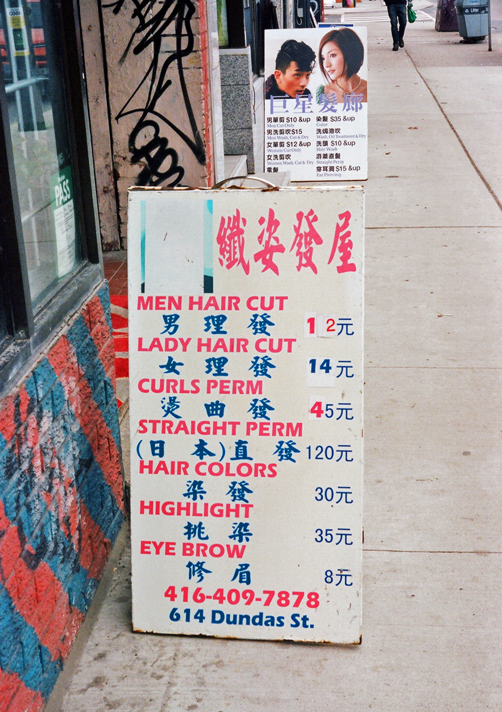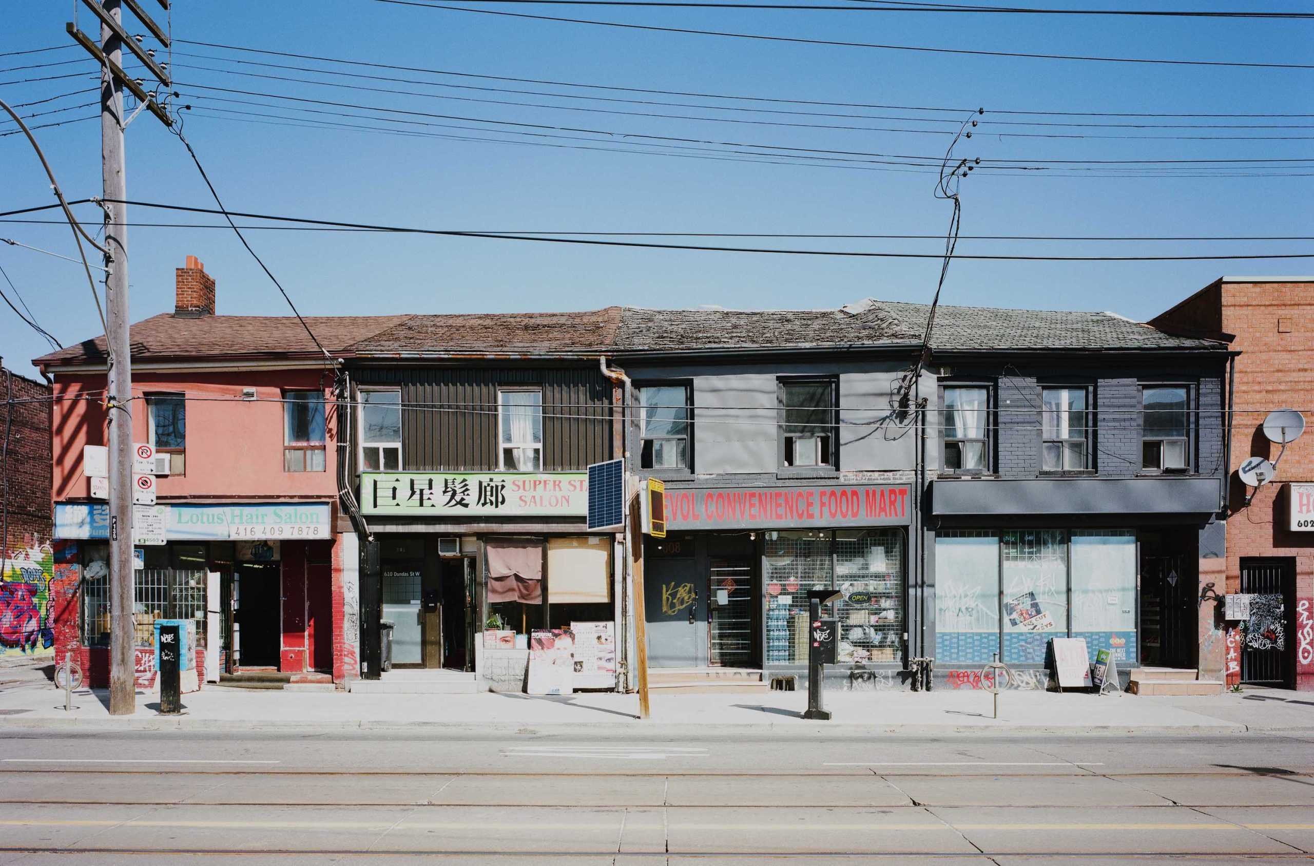 For the most part, the buildings on the north side of Dundas Street West between Spadina and Bathurst are an architectural hodgepodge. The one exception to the general heterogeneity was, until recently, the block of four matching storefronts at 606-614 Dundas West, between Augusta and Denison. In 1992, I photographed this quaint commercial row in black and white. In 2023, noticing how much it had deteriorated, I returned to document it in colour.