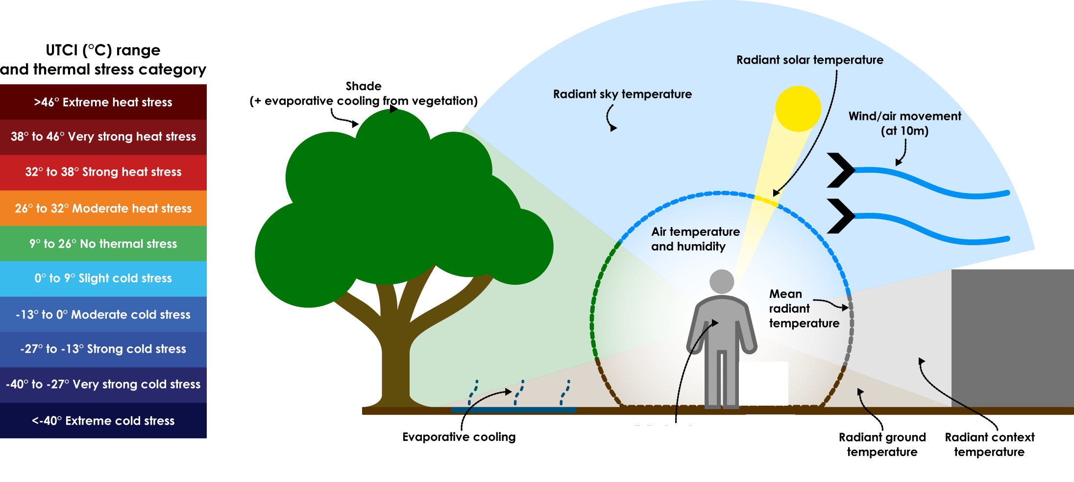 Four key factors are measured to determine thermal comfort: wind, humidity, air temperature, and radiant temperature. Together, these factors are combined into an equivalent temperature called the Universal Thermal Climate Index (UTCI). The report lays out a target for the percentage of time that the UTCI of a public space should land in a comfortable range for the various times of year: winter, summer and the shoulder months. Anybody can use the guidelines to learn how to design with thermal comfort in mind, but only city-initiated planning and large area studies are required to measure thermal comfort. The city recommends that both large park capital projects and large-site development projects over 5 hectares also undertake a voluntary analysis.