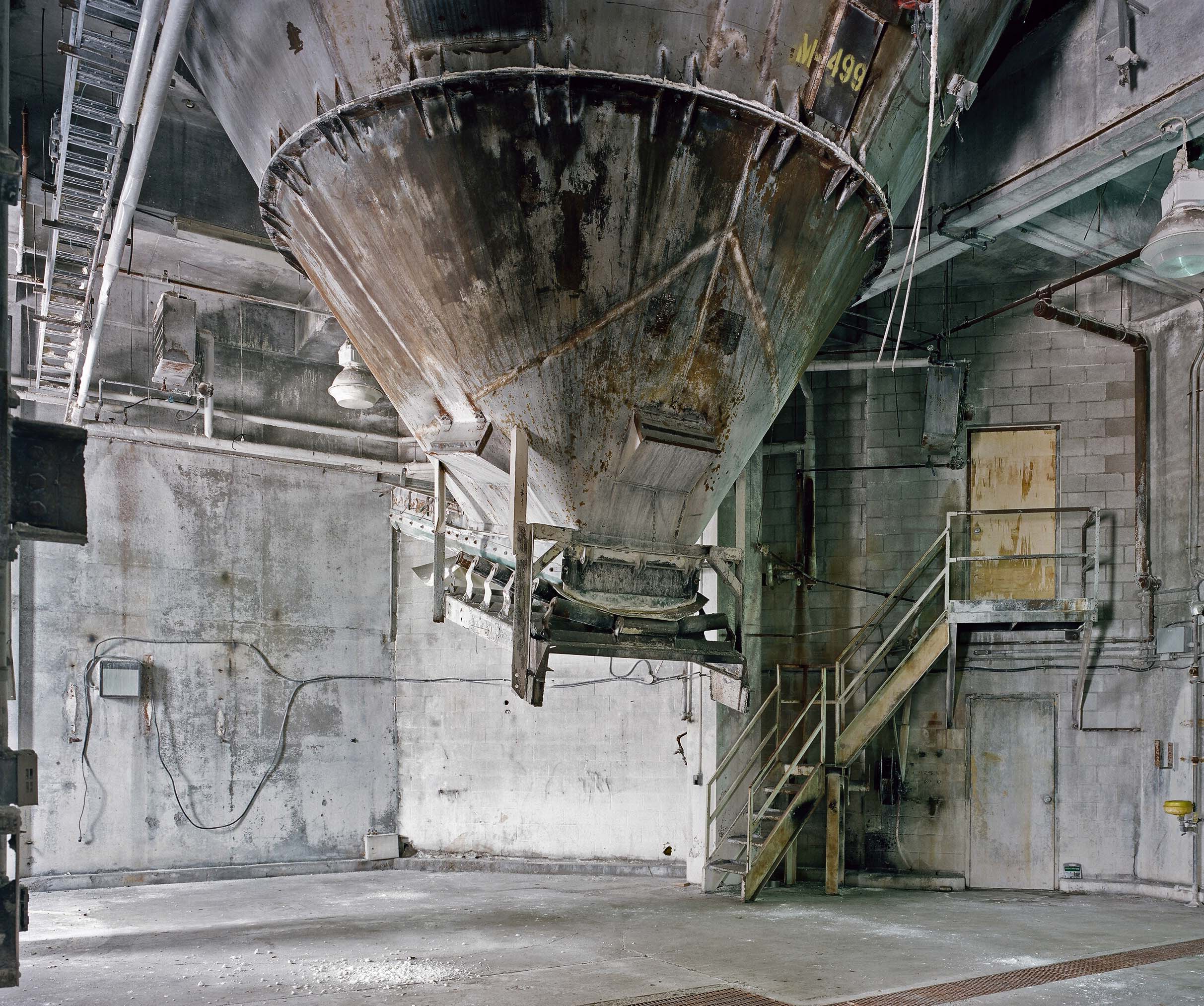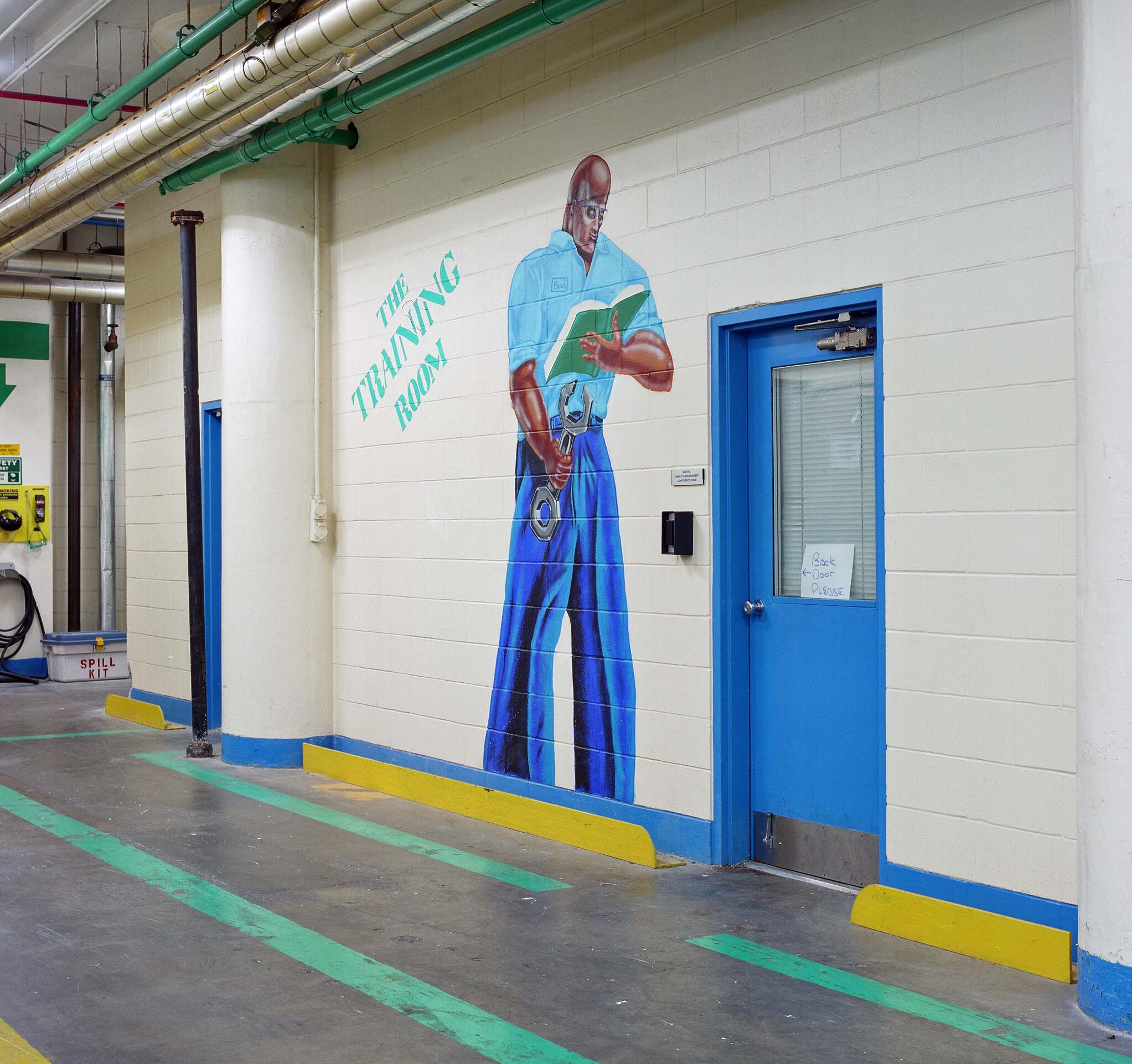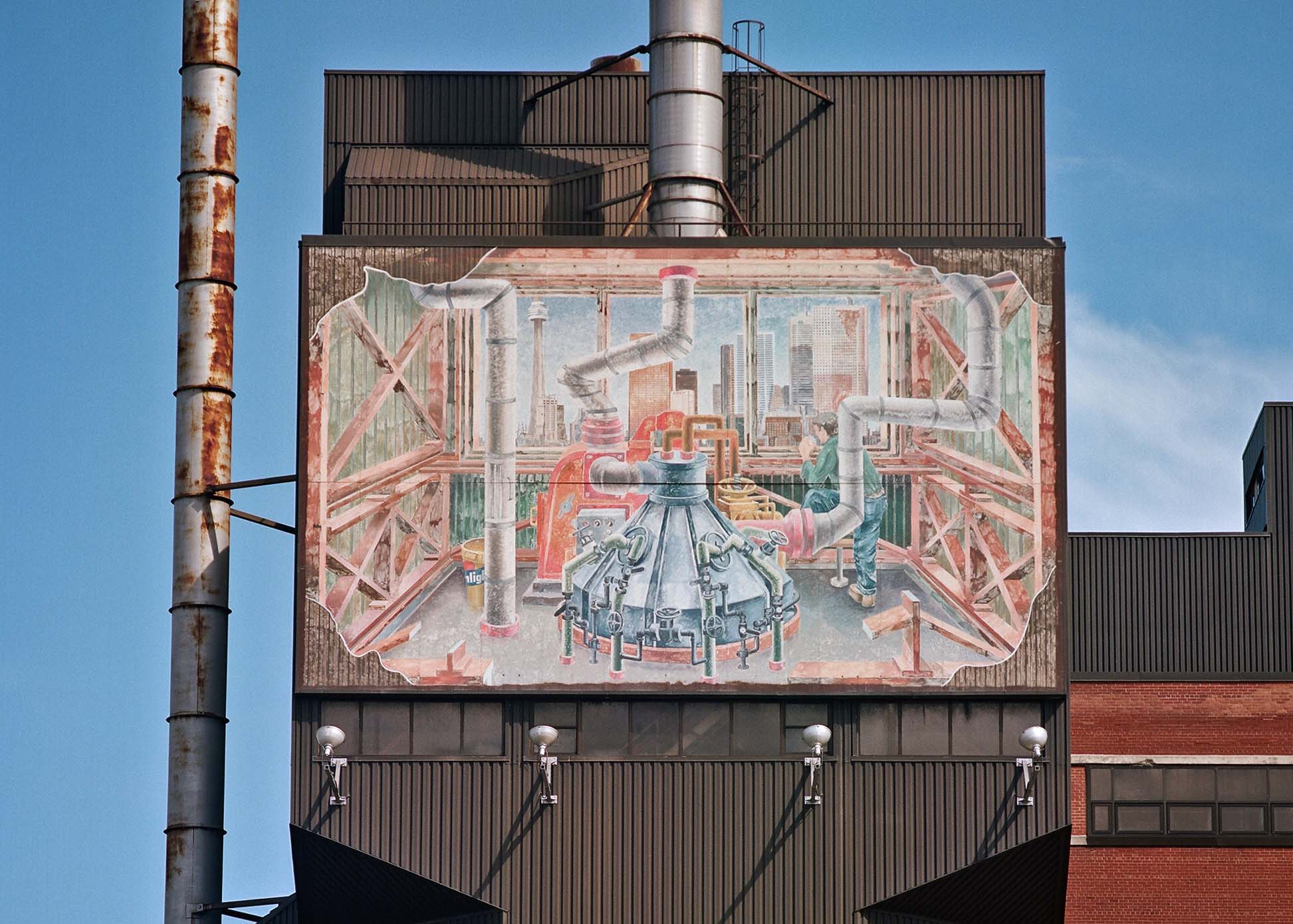 For his mural, Woolf chose to offer the public a view into the interior of an imaginary mechanical room at the very top of the tower. To reinforce the impression of a cutaway view, Woolf used several ingenious framing devices. At first glance, the composition presents itself as an irregular cartouche attached directly to the vertical metal cladding of the spray tower. Closer inspection reveals that the areas of wall at the four corners are actually painted in trompe-l’oeil on the flat panel.